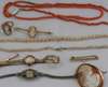 a 9ct gold cased wrist watch and bracelet, cameo brooch and ring, two coral necklaces, cameo bar brooch, marcasite set wrist watch, a string of graduated baroque pearls (qty)