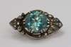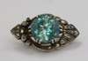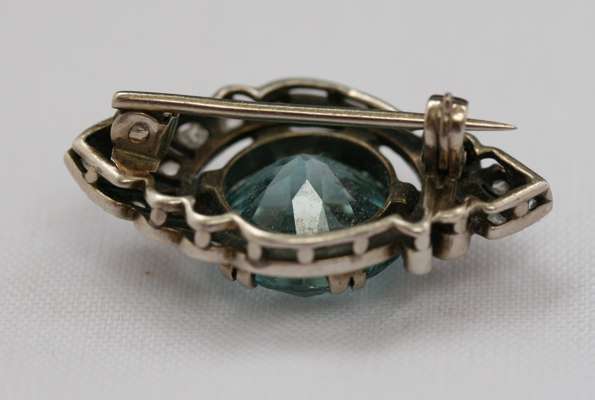 the circular zircon claw set and with rose cut diamond set palmette motif to each side, plain pin fitting