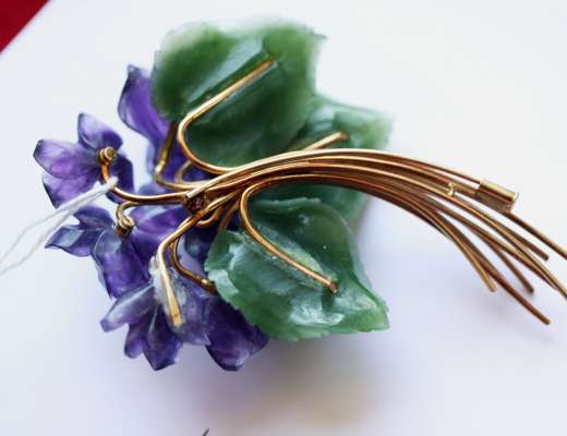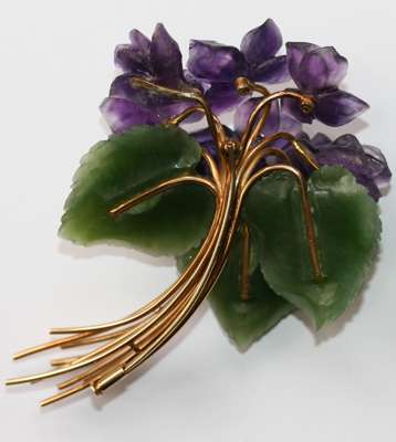 composed of naturalistically carved amethyst flowerheads, each claw set to the centre with a round brilliant cut diamond, above foliate carved jade panels and wire work scroll stems