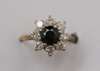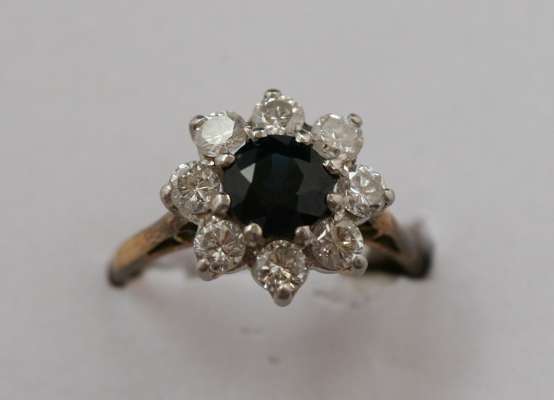 the circular cut sapphire with a border of eight brilliant cut diamonds, 18ct gold shank