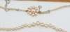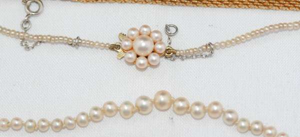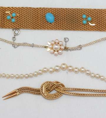of tight 'V' links, knot terminal, together with a yellow metal bracelet onset turquoises and a pearl necklace of graduated form (untested) from 2.5mm to seed pearls, pearl set 9ct gold clasp