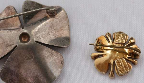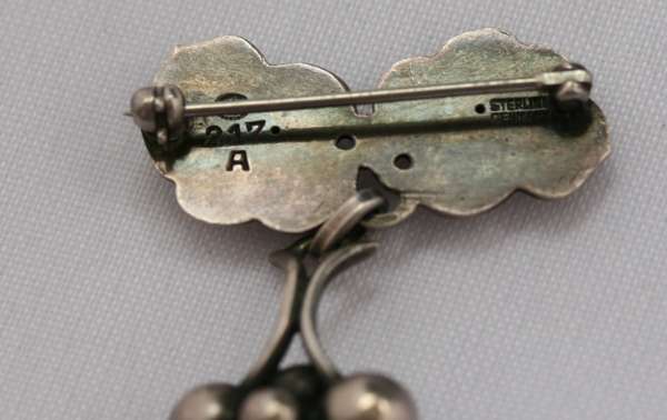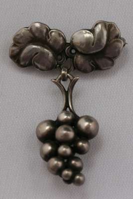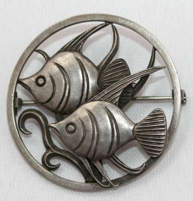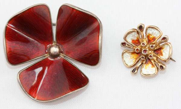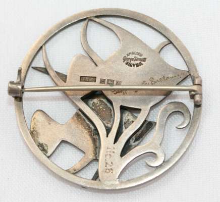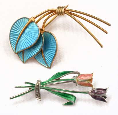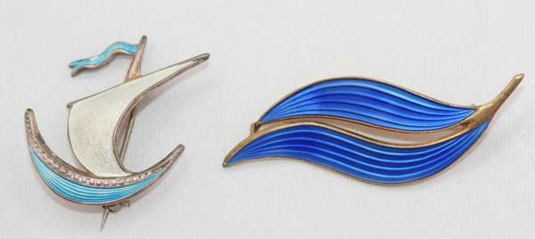 Geoffrey Bellamy for Tarrat silver a circular brooch with two angel fish and numbered 26, Georg Jensen a silver brooch as a bunch of grapes, four Norwegian silver and enamel brooches and a silver gilt and enamel floral brooch (8)