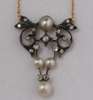 of scrolling form and set three principal pearls with millegrain set diamonds to the scrolling frame, all on a fine link neck chain
