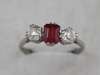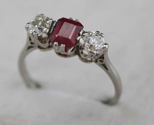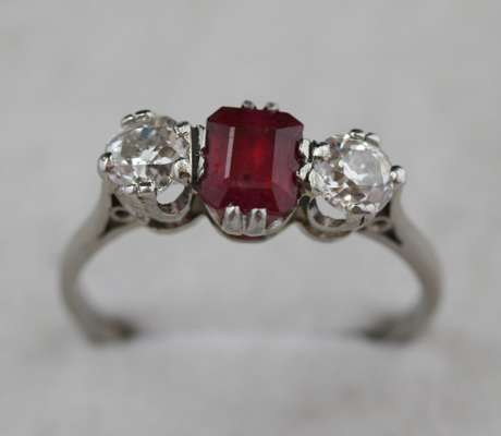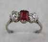 the rectangular cut ruby claw set and with a circular brilliant cut diamond to each side, all set in platinum