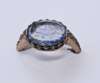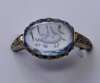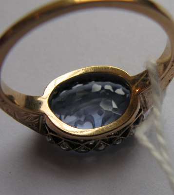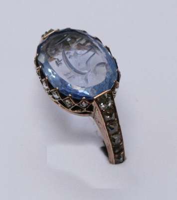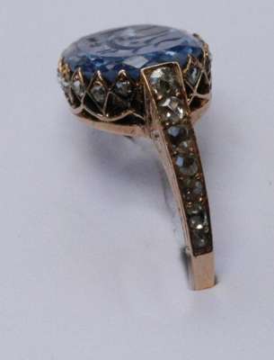 claw set with an oval cut sapphire, of a pale cornflower-blue hue, the table facet incised with Arabic writing, with rose cut diamond set pierced gallery, additionally set to each shoulder with seven graduated old mine cut diamonds, with foliate scroll engraved sides to the shank