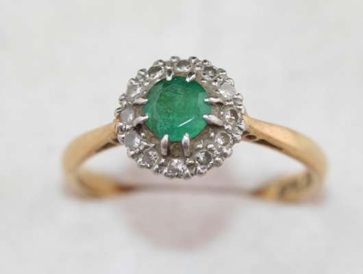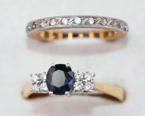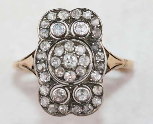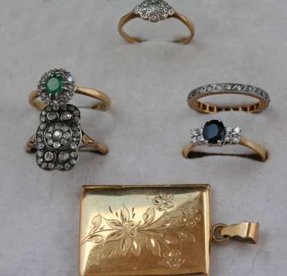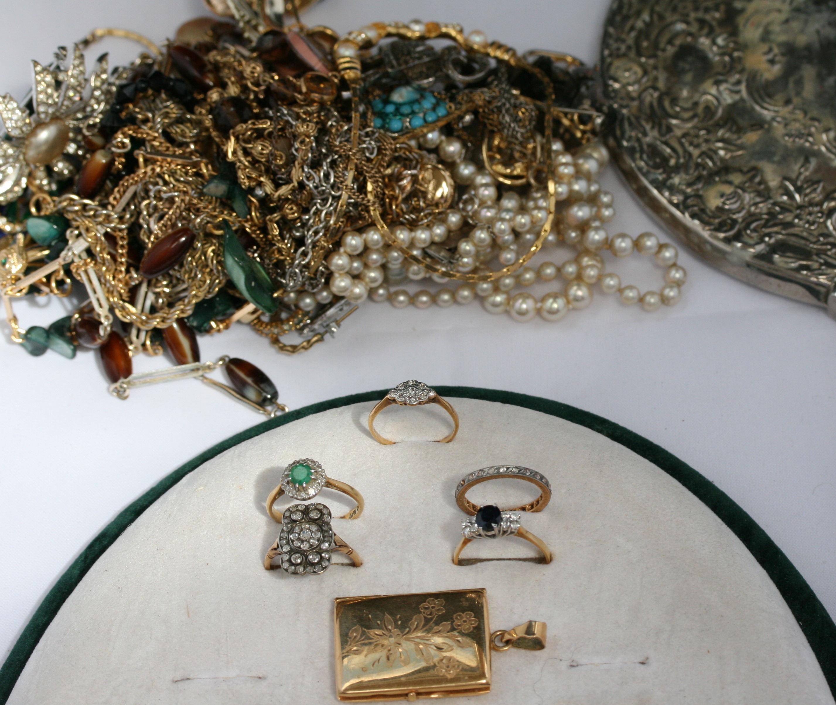 an Edwardian panel ring set central cluster of diamonds with shaped border of further diamonds, a small emerald and diamond cluster ring, an eternity ring, a modern sapphire and diamond cluster ring, a diamond cluster ring, a locket with engraved decoration, a hand mirror and a quantity of miscellaneous costume jewellery
