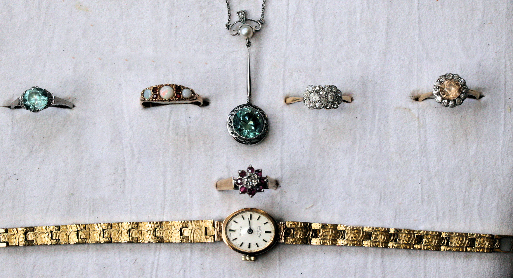 to include an 18ct white gold mounted blue zircon and diamond set ring, a similarly set pendant with chain; four assorted gold mounted multi-gem set rings and a lady's gold plated Rotary wrist watch (7)