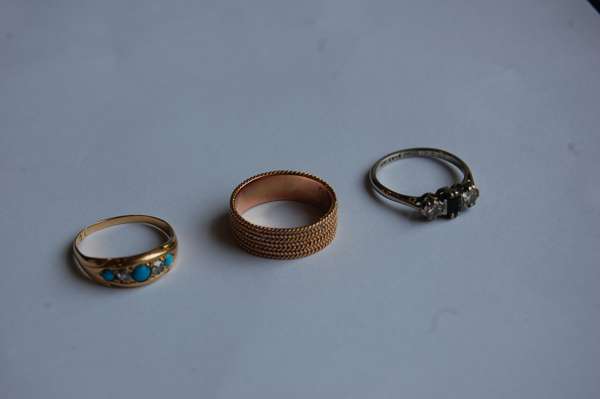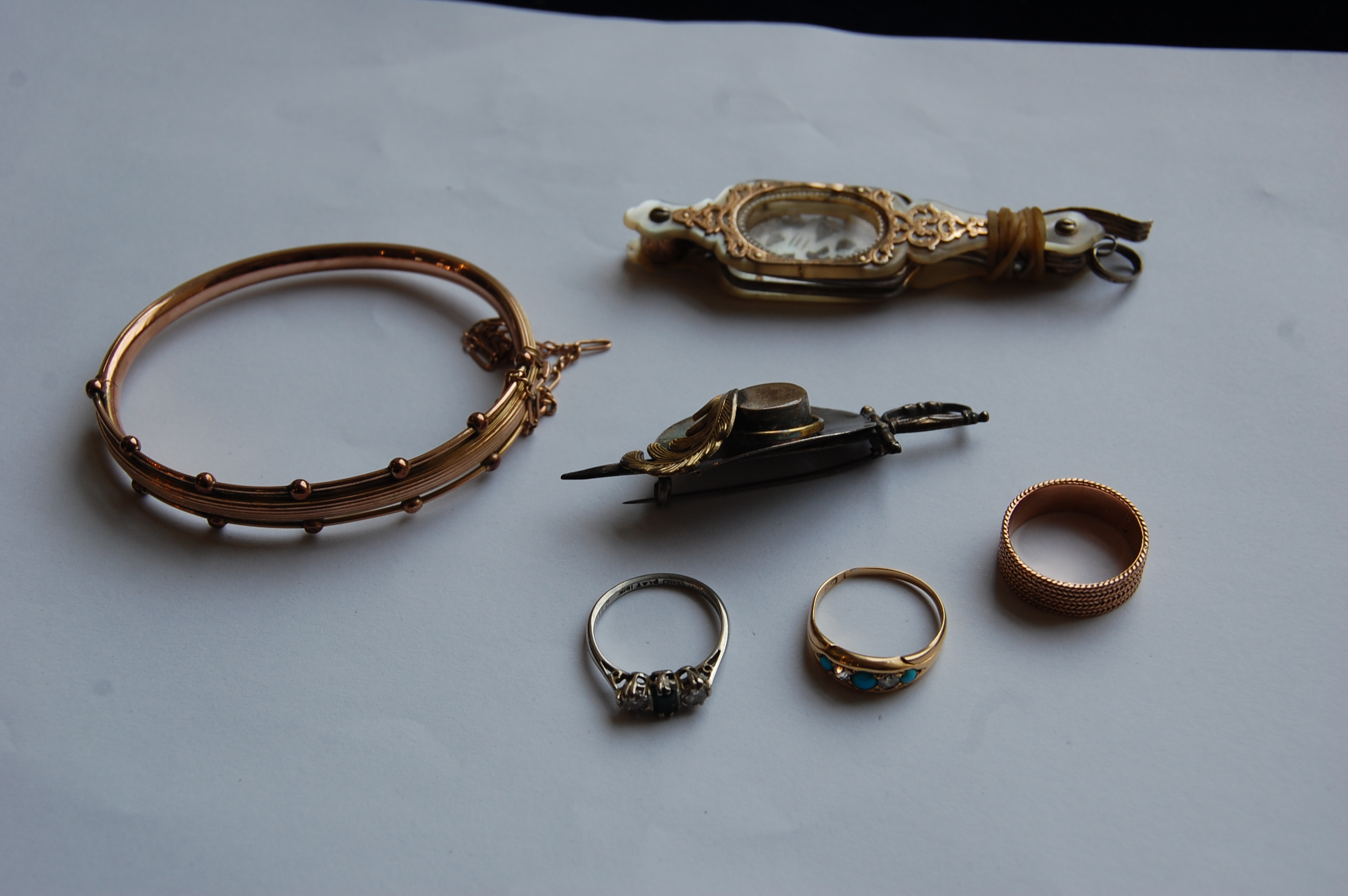 a small emerald and diamond ring set central rectangular cut emerald and diamond to each side, a turquoise and diamond ring, a 14K gold band, set of gold mounted mother of pearl lorgnettes, a hinged 9ct gold bangle, a silver brooch modelled as a rapier and Spanish style hat with gilt plume