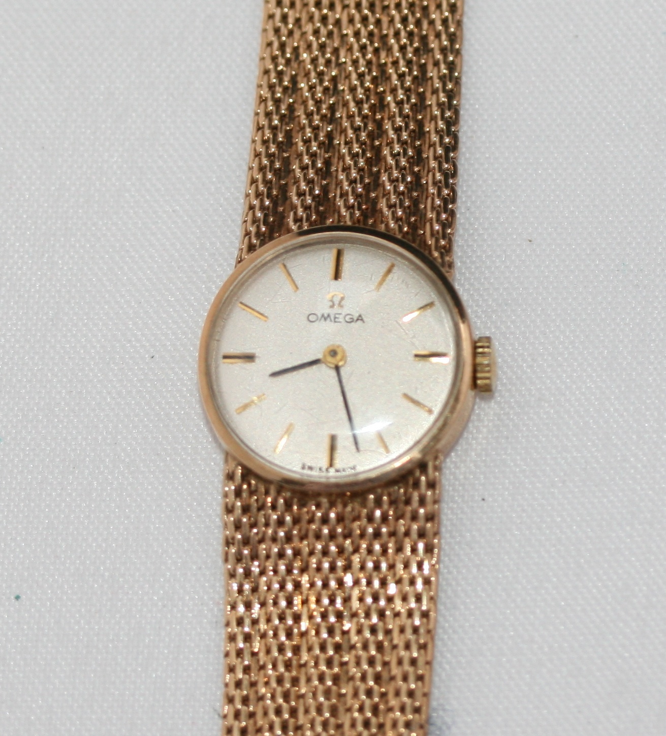 circular champagne dial, with textured flexible gold Omega bracelet, in Omega box