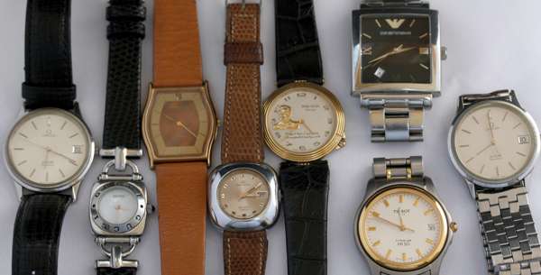 including Movado Queenmatic surf 210, two Favre Leuba watches, two Omega de Ville quartz watches, Gucci 6300L wrist watch, Emporio Armani wrist watch, Tissot T50 watch, some with boxes