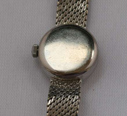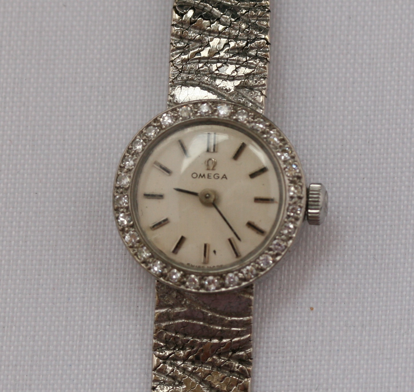 the circular dial with a diamond set bezel, textured flexible bracelet, with extension piece