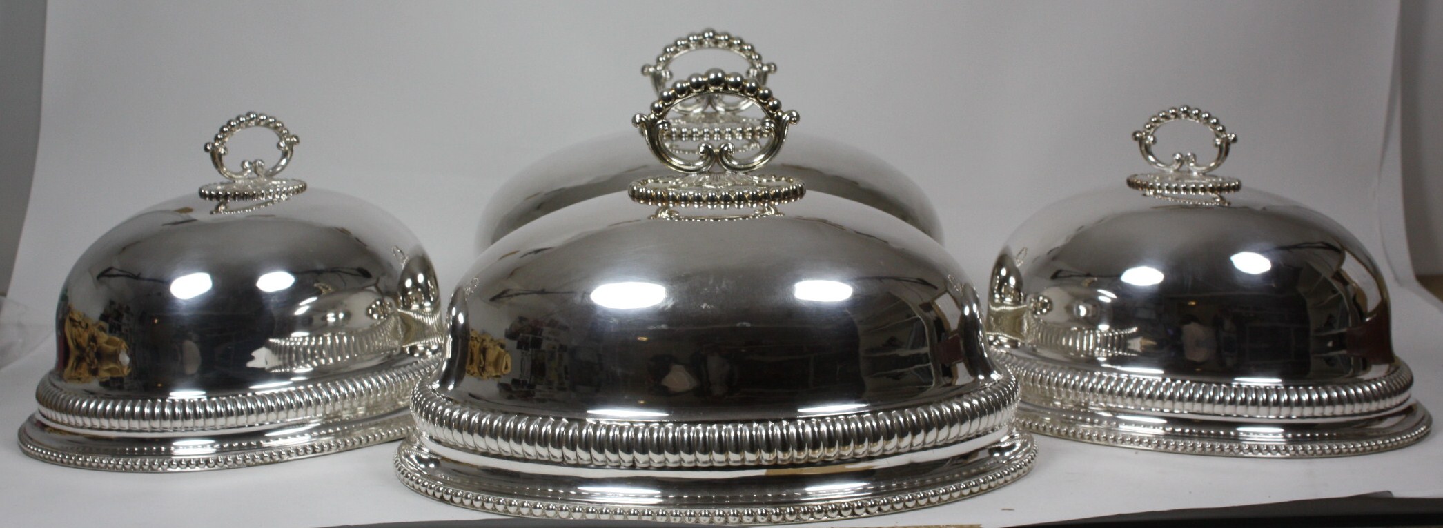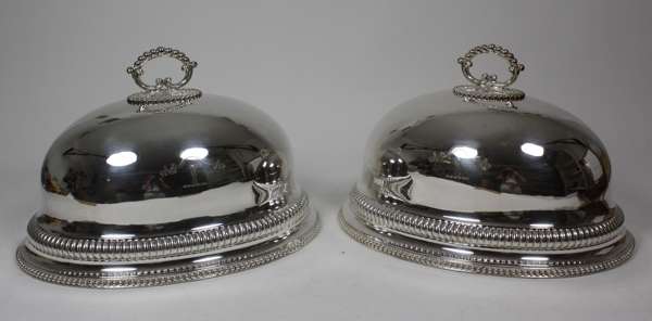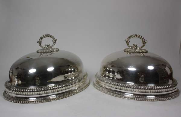 of typical domed form with gadrooned rims and engraved crest and motto, with central beaded loop handle on domed acanthus support
