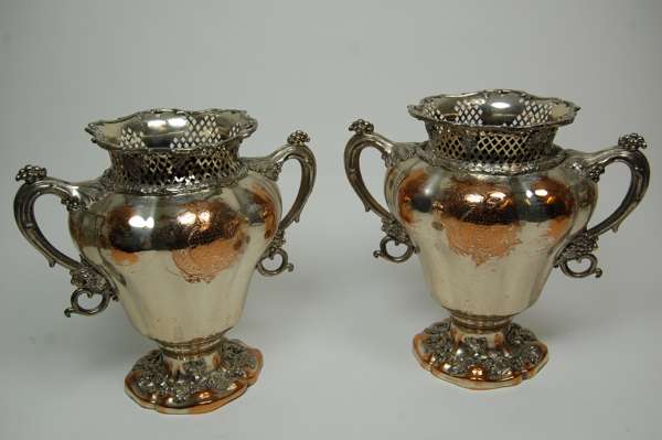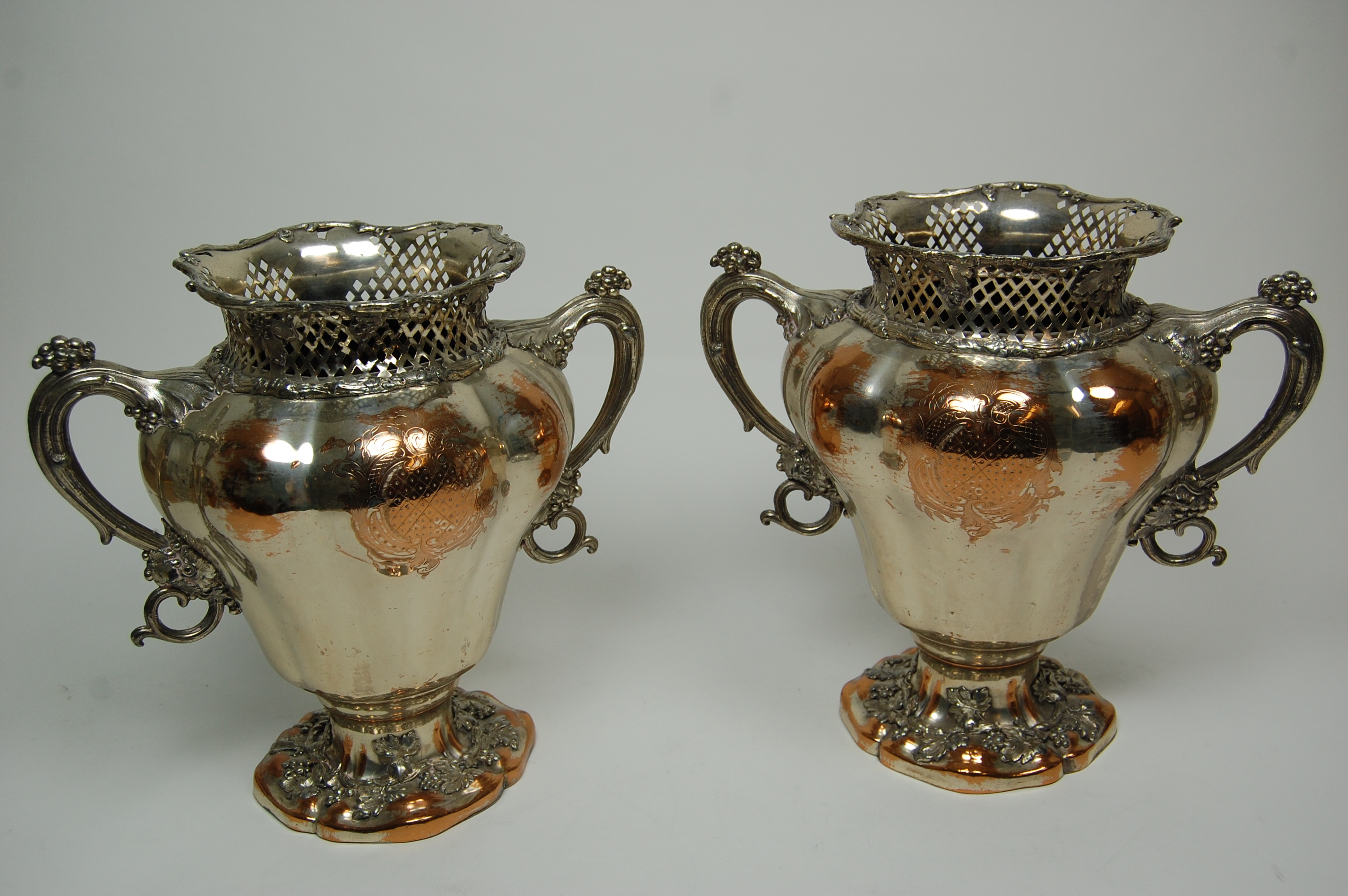 marked HR, with crossed keys, each of lobed shouldered form with everted lattice pierced rim with applied fruiting vines and engraved coat of arms, with naturalistic S scroll handles formed as vines, on a spreading lobed base with similar decoration (2)
