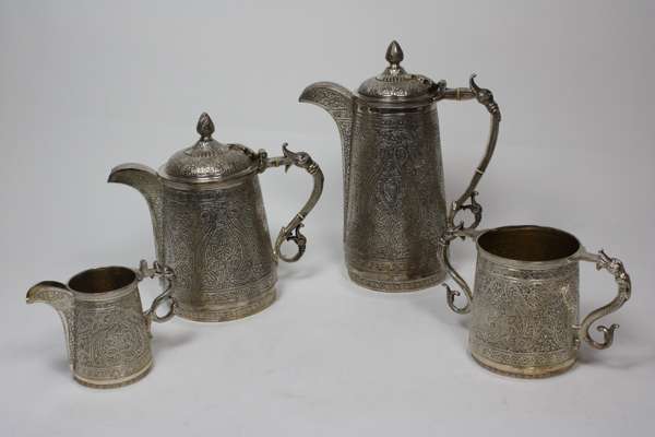 R&B, comprising water pot, teapot, milk jug and twin handled sugar bowl, the slightly flared bodies with all over Arabesque decoration, with S scroll mythical beast handles