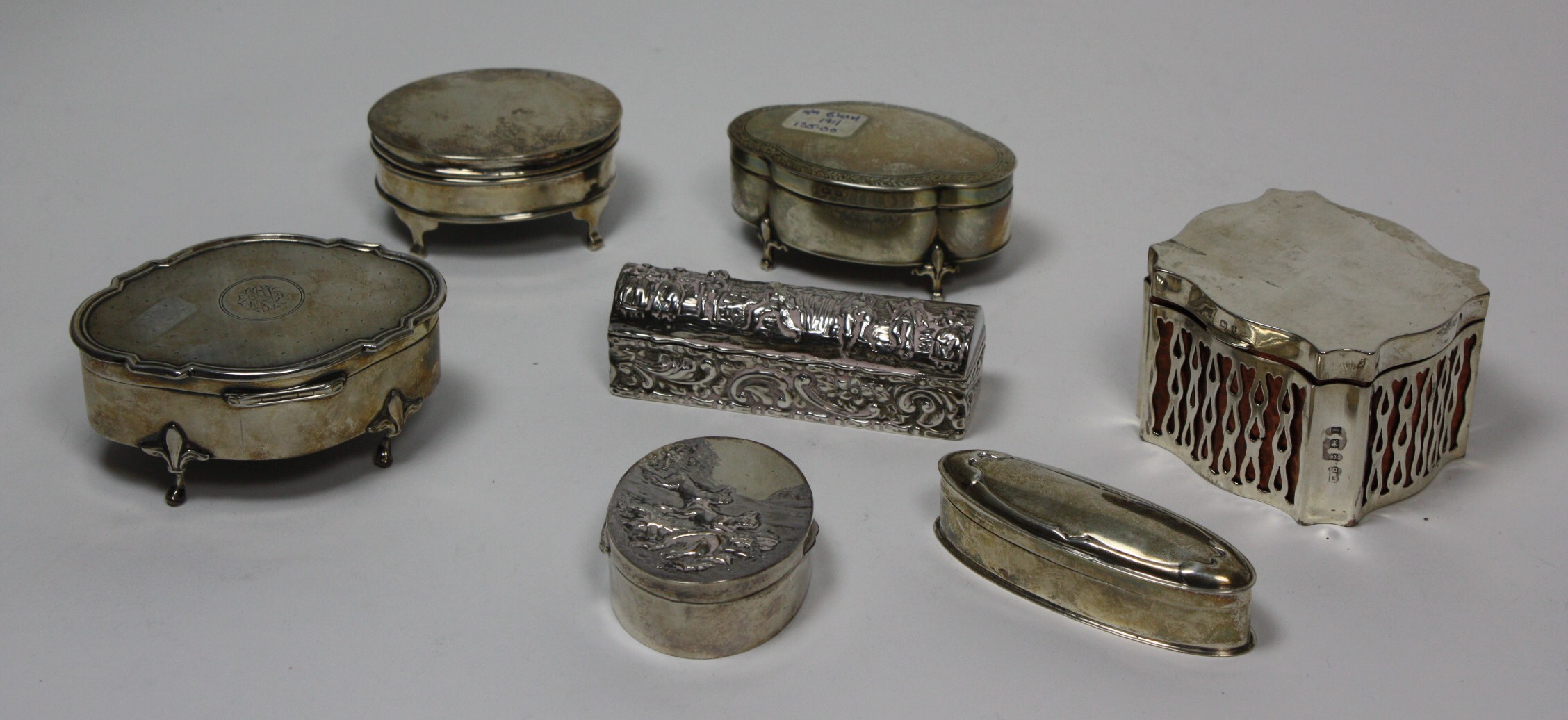 three of typical form with shaped outline and raised on bracket feet; one pierced example with copper liner; an embossed pin case with domed cover and country scene; and two others (7)
