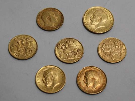 to include five half sovereigns, one sovereign; together with an Edward VII half sovereign (7)