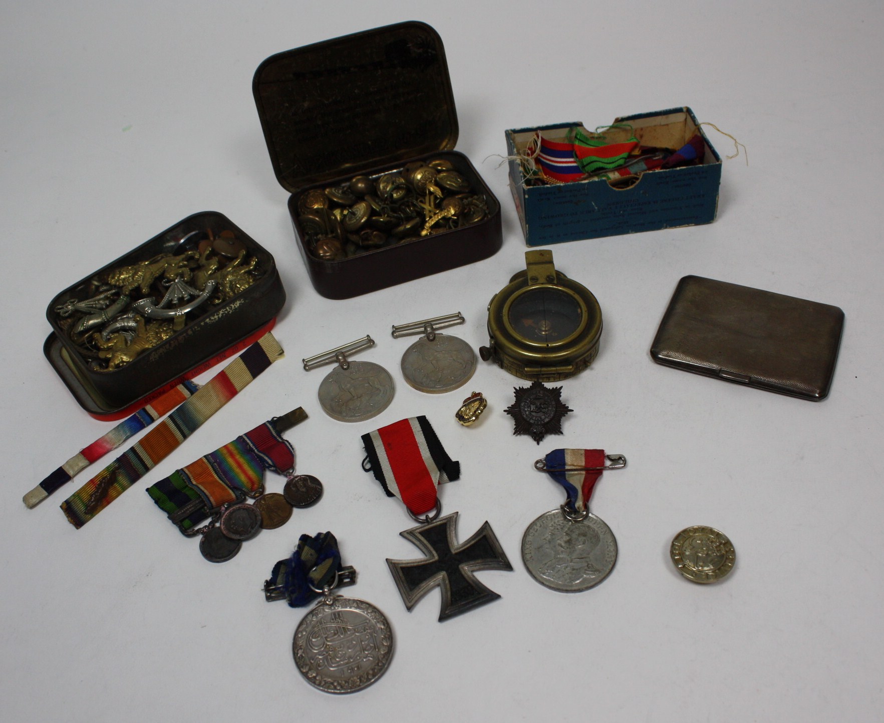 un-named as issued, with silver buckle; an Edward VII and later miniature medal group; together with various cap badges, collar dogs and medal ribbons etc (qty)