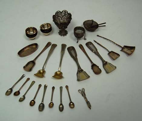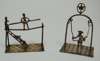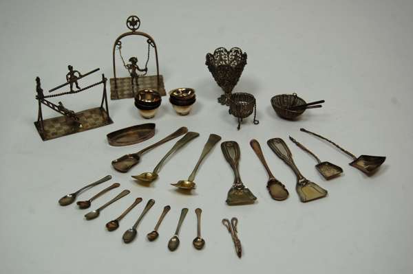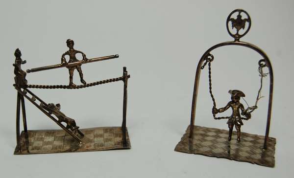 one formed as a boy on a swing the other as three tightrope walkers, each on simple bases with engraved decoration, together with a group of continental miniature dolls house accessories and spoons etc (qty)