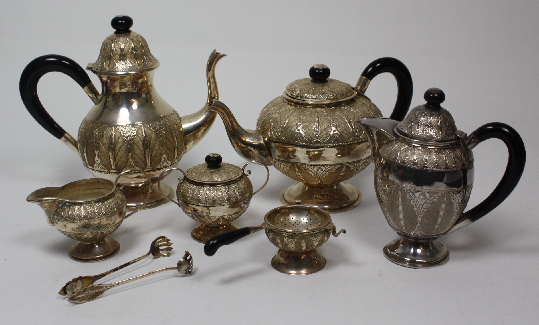 comprising coffee pot, water pot, teapot, milk jug, covered sugar bowl, tea strainer and stand and tongs, all with profusely chased foliate clasped decoration, and composite C scroll handles
