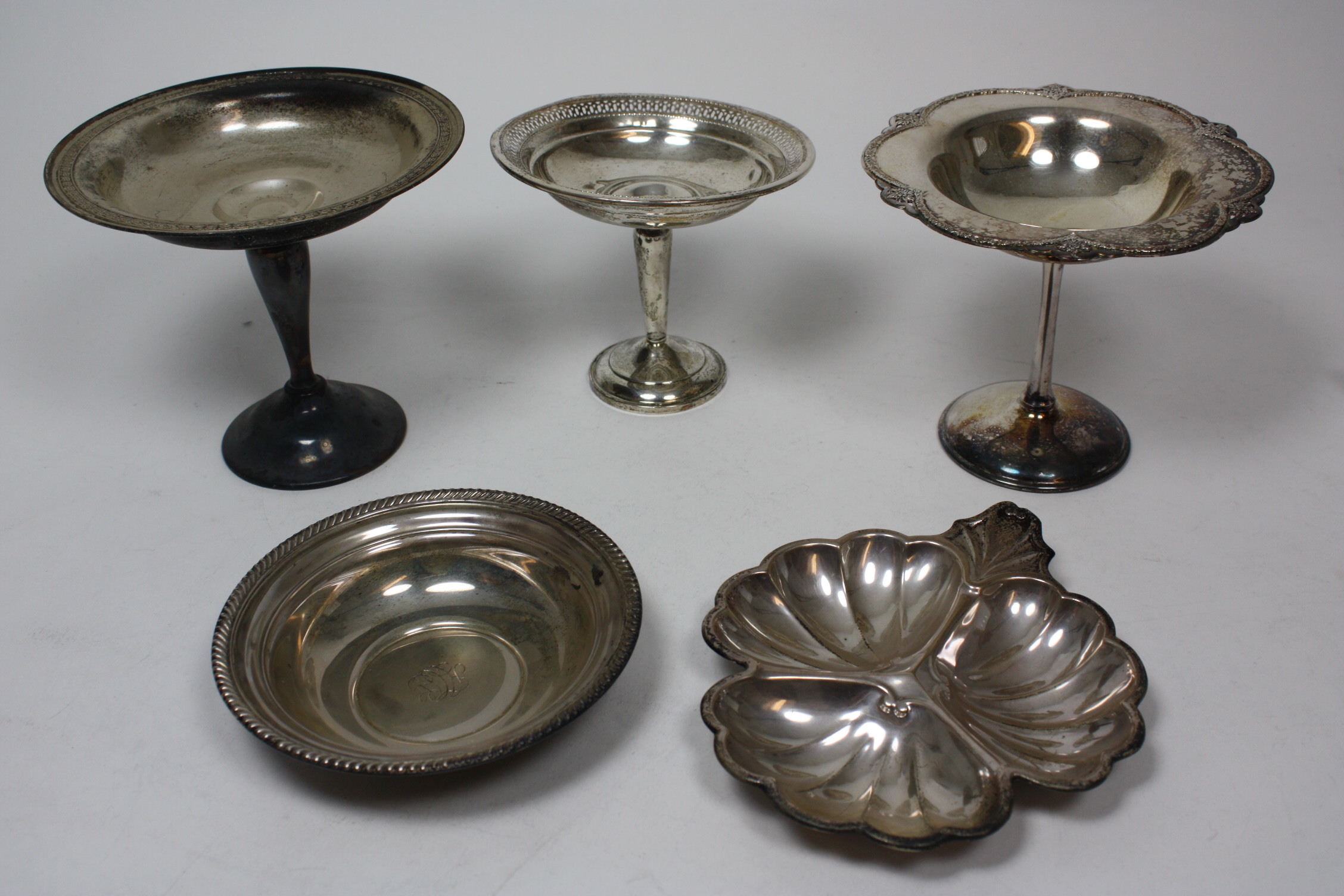 mainly by Gorham, of typical comport form with shallow bowl resting on slender stem; together with various small dishes and bowls etc (5)