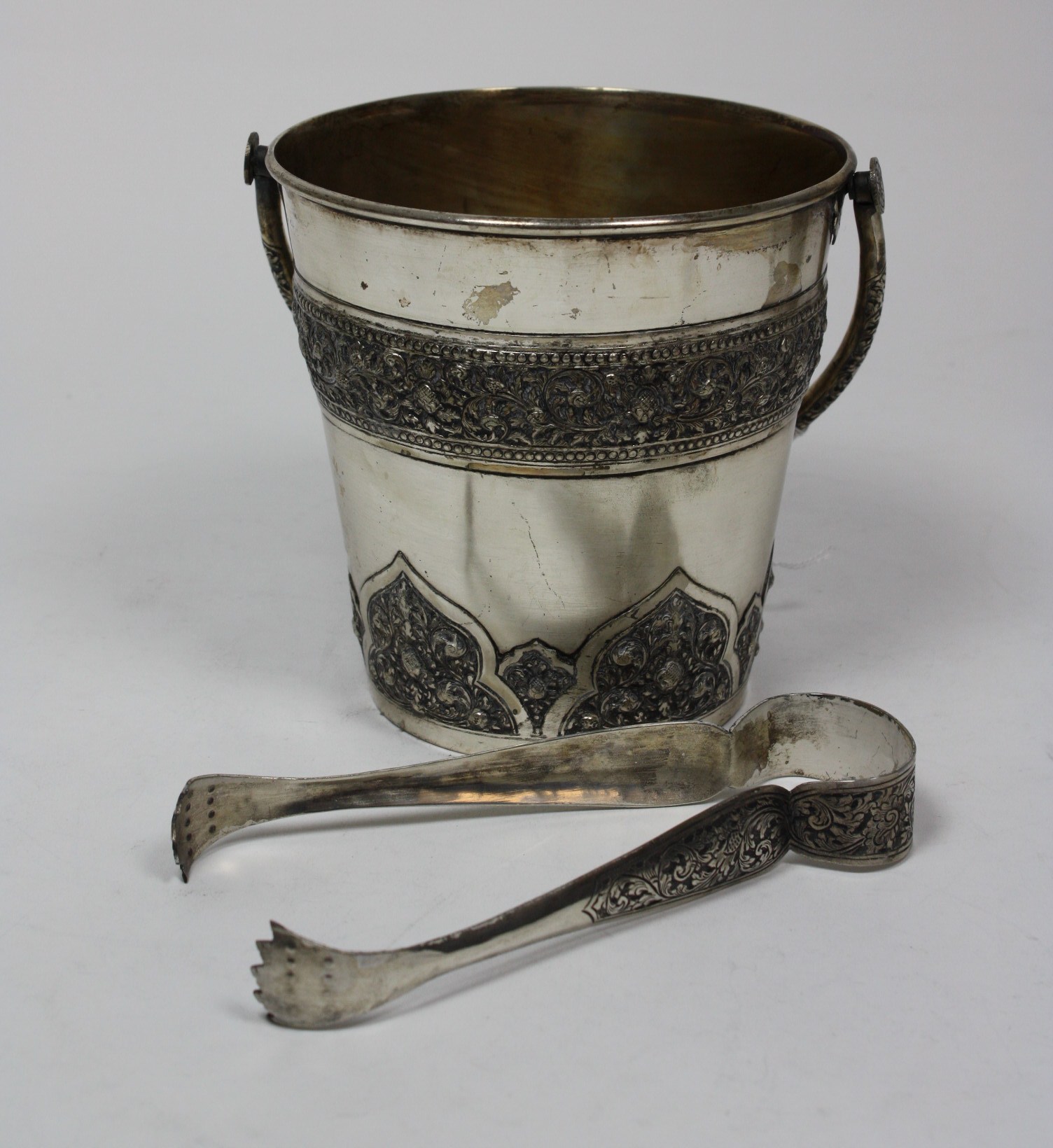 marked 800, the tapered bucket with central band of embossed foliage and the lower section with panels of scrolls, with hinged handle and tongs