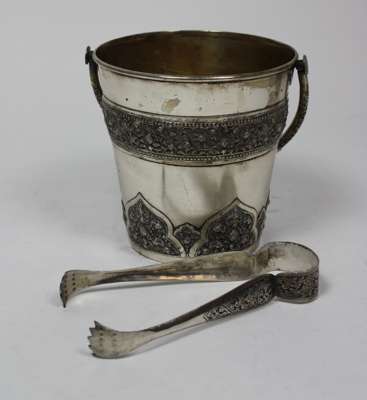 An Indian white metal ice bucket and tongs