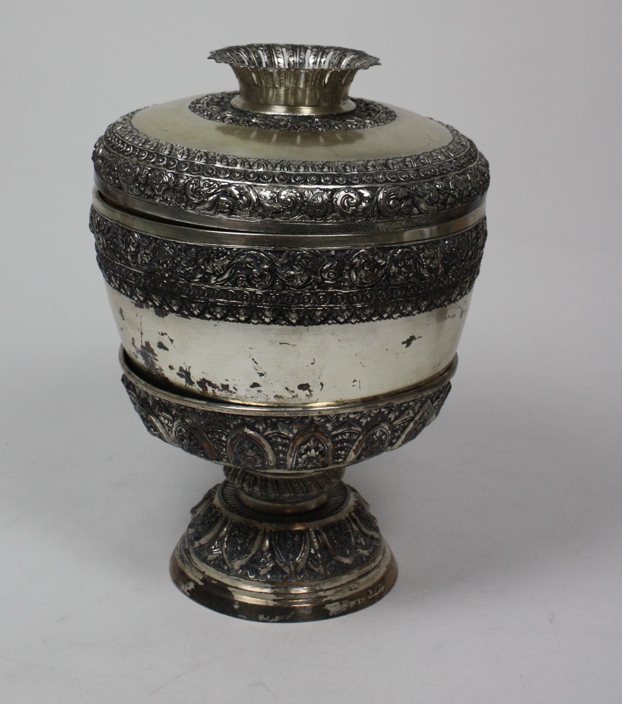 An Indian white metal covered bowl and stand