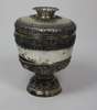 marked 800, the simple bowl with large band of scrolls and foliate with pull off cover similarly decorated, raised on a dished stand with waisted stem and spreading foot, with profusely embossed decoration