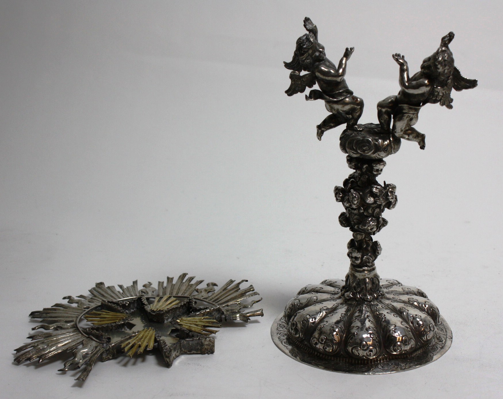 possibly Dutch, the cast figural stem formed as winged cherubs supporting two cherubs clasping the central cross and rays, the lobed base with scroll details