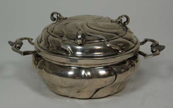 probably Augsburg 1749-51, the bowl and cover of semi spiralled fluted form with twin loop handles, the pull off cover with triple loop 'feet'