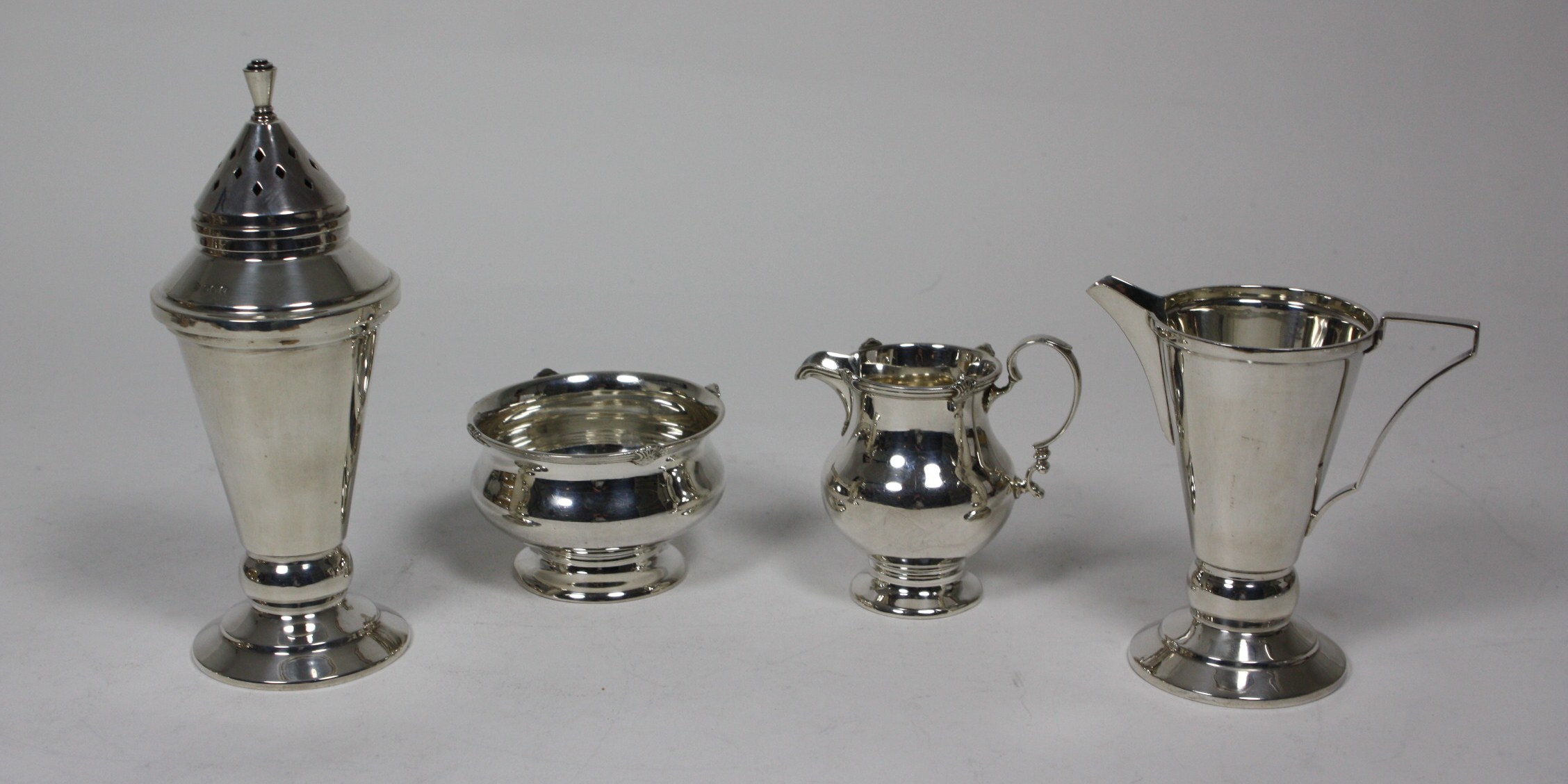W Hutton & Sons, Sheffield 1937 & 1938, of tapered conical form with stepped spool foot and angular handles, the sugar caster with pierced cover together with a baluster sugar bowl and cream jug with everted rims and shell details, London 1904 (4)