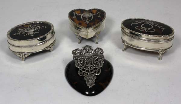 A group of three silver and tortoiseshell dressing table boxes