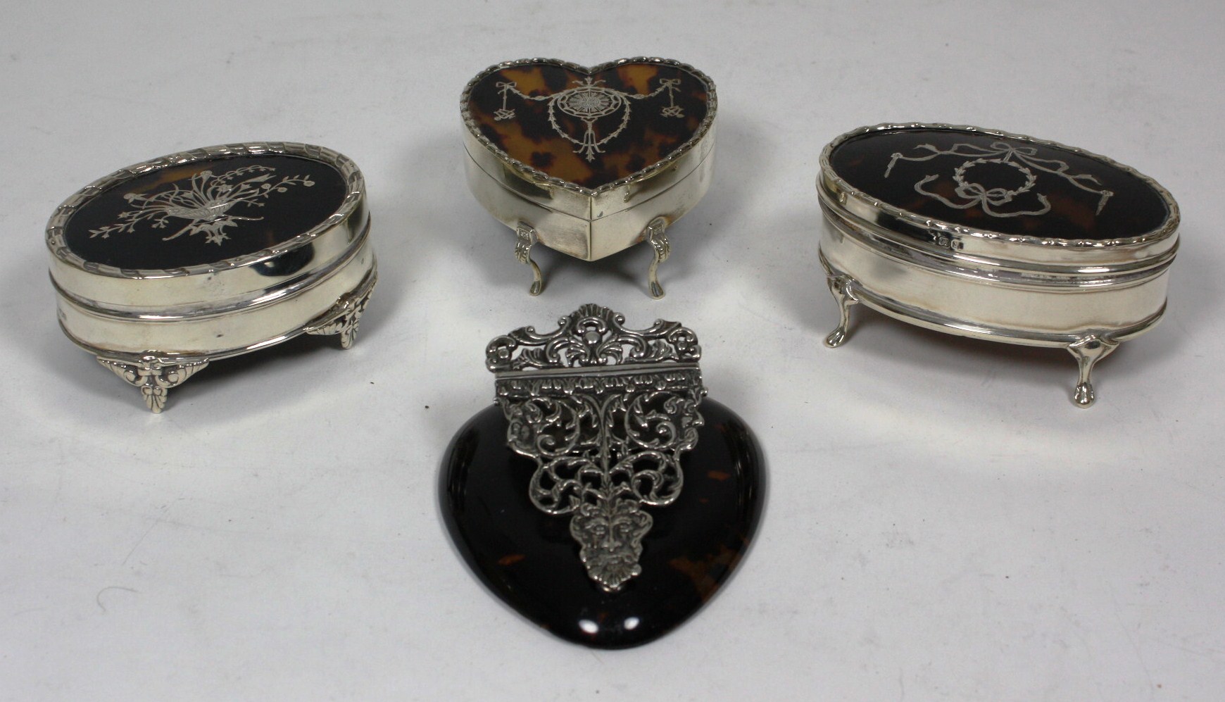 two by W Comyns, one indistinctly marked, each with tortoiseshell cover inlaid with floral and ribboned garlands, raised on bracket feet; together with a tortoiseshell and silver desk clip with Bacchus head and scrolls (4)