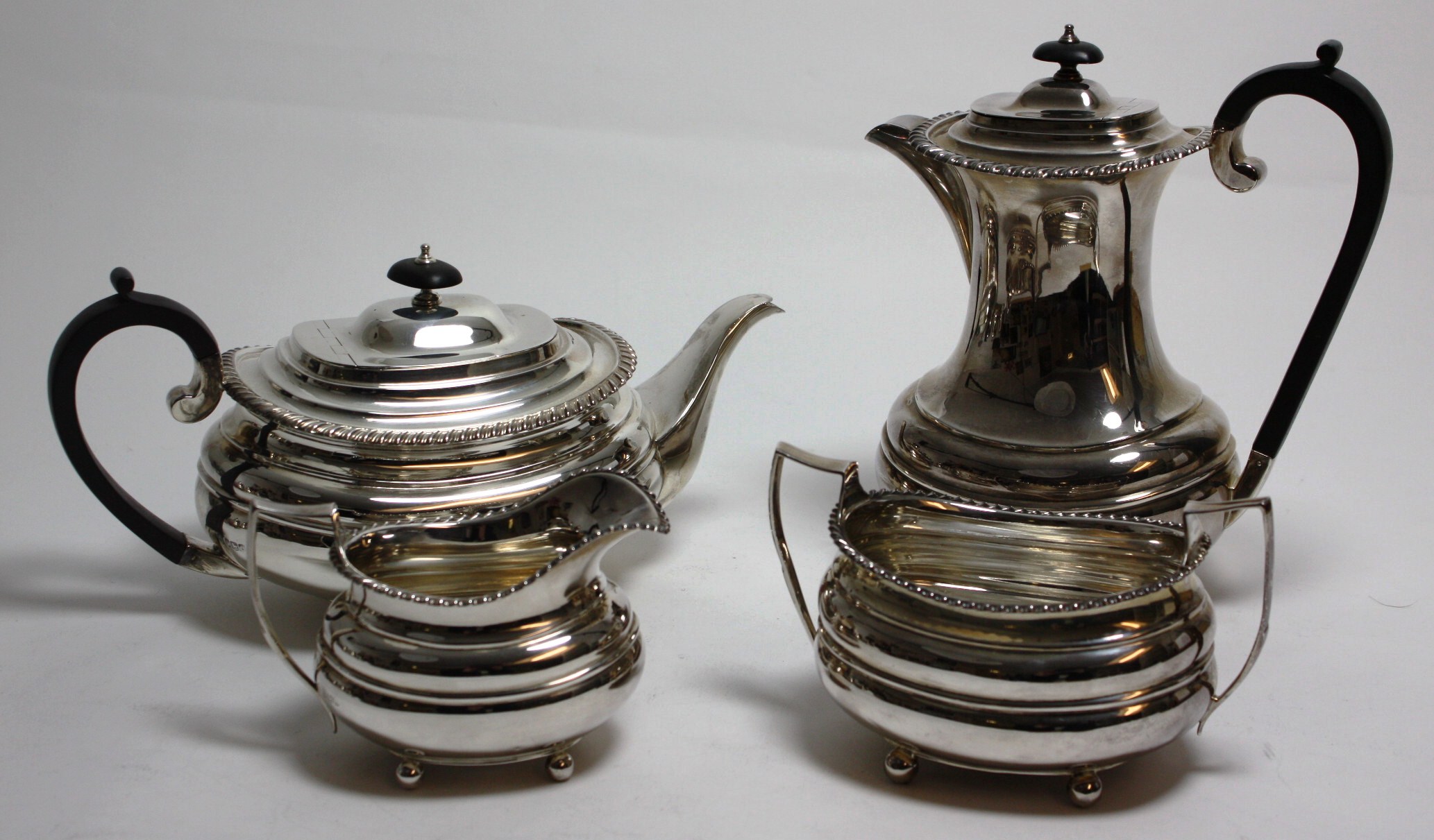 W Hutton & Sons Ltd, Sheffield 1937, comprising water pot, teapot, twin handled sugar bowl and milk jug, the plain baluster bodies with gadrooned rim and simple S scroll handles (4)