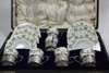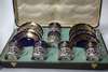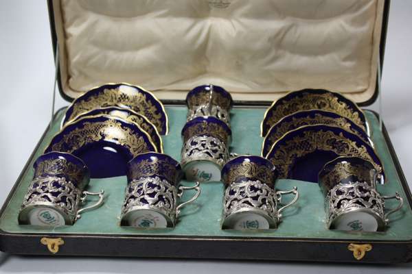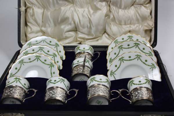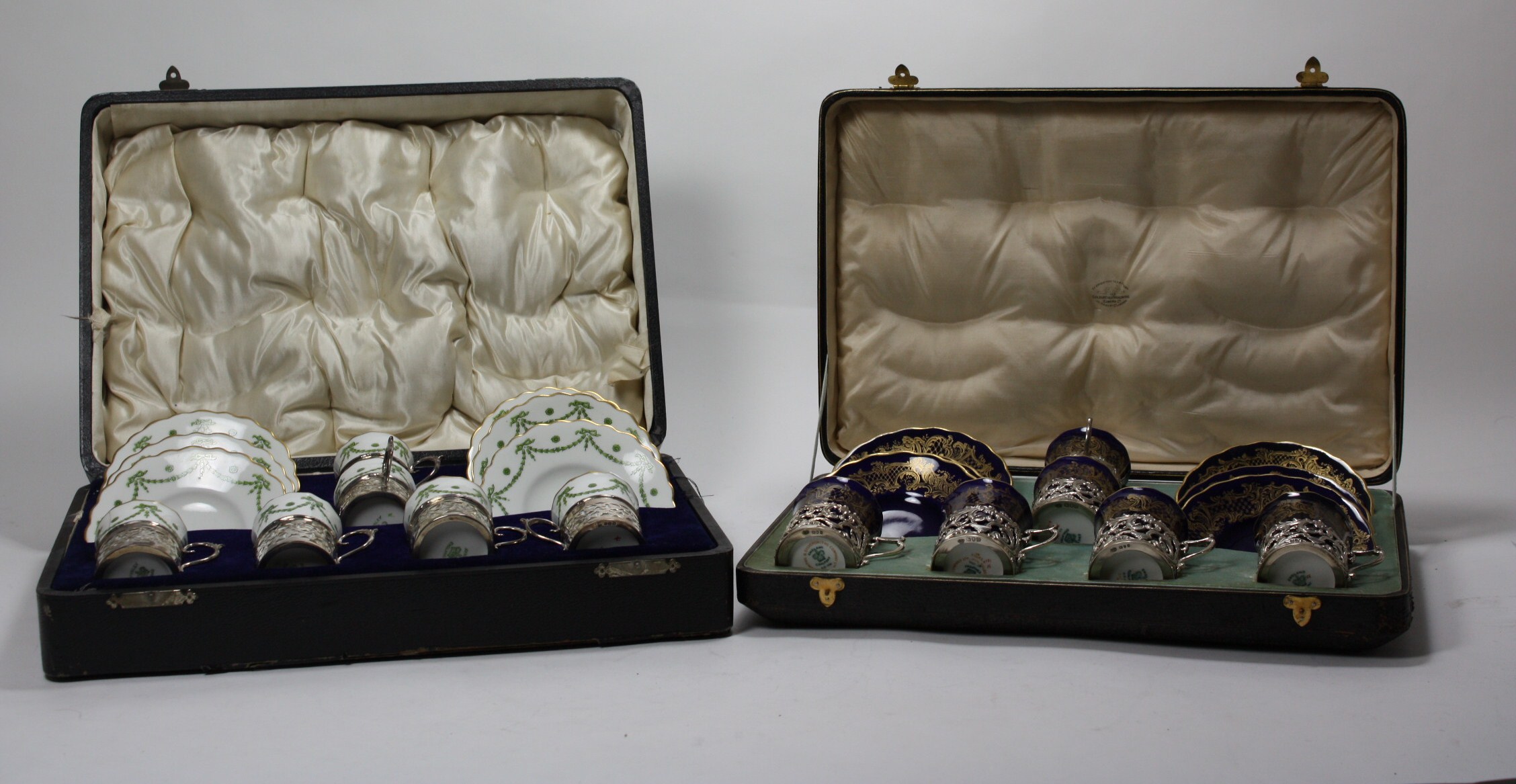 the mounts by Goldsmiths & Silversmiths Company, London 1909, of embossed scroll form with vacant cartouche, with six blue and gilt Coalport cups and saucers in fitted case; together with a second set by Aynsley with green garland decoration and mounts to cups Birmingham 1911, in fitted case (2)