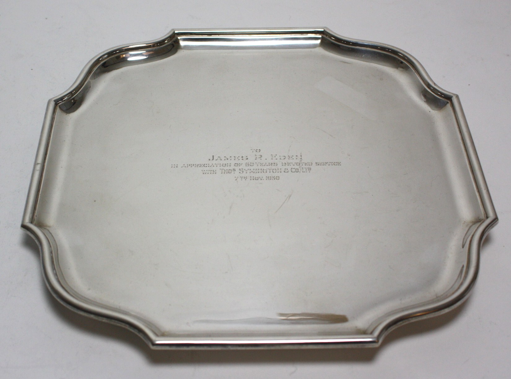 Brook & Sons (of Edinburgh), Sheffield 1955, of canted rectangular form with presentation inscription, raised on four compressed ball feet