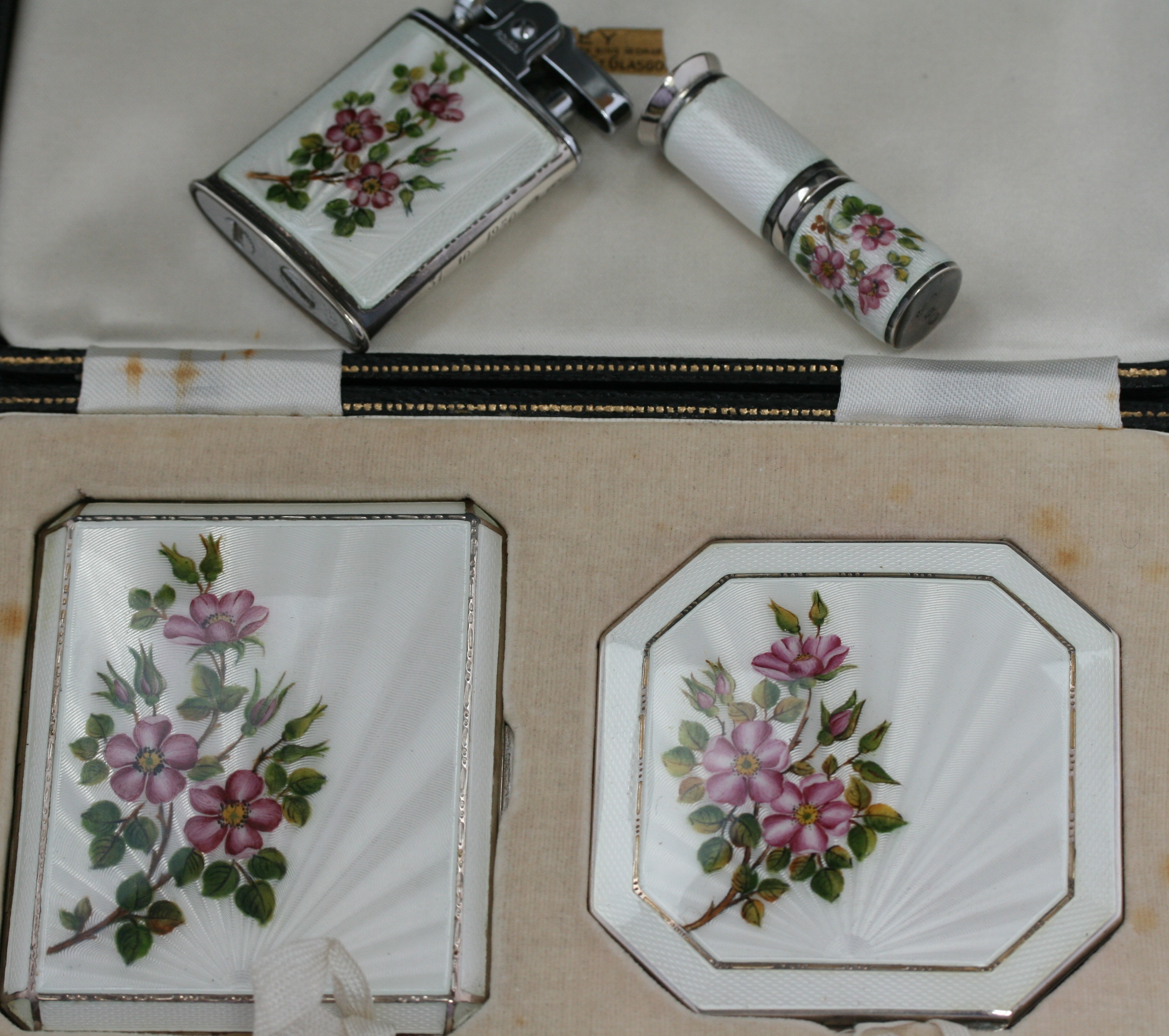 white guilloche ground with floral sprays, and a matching lipstick holder and lighter,