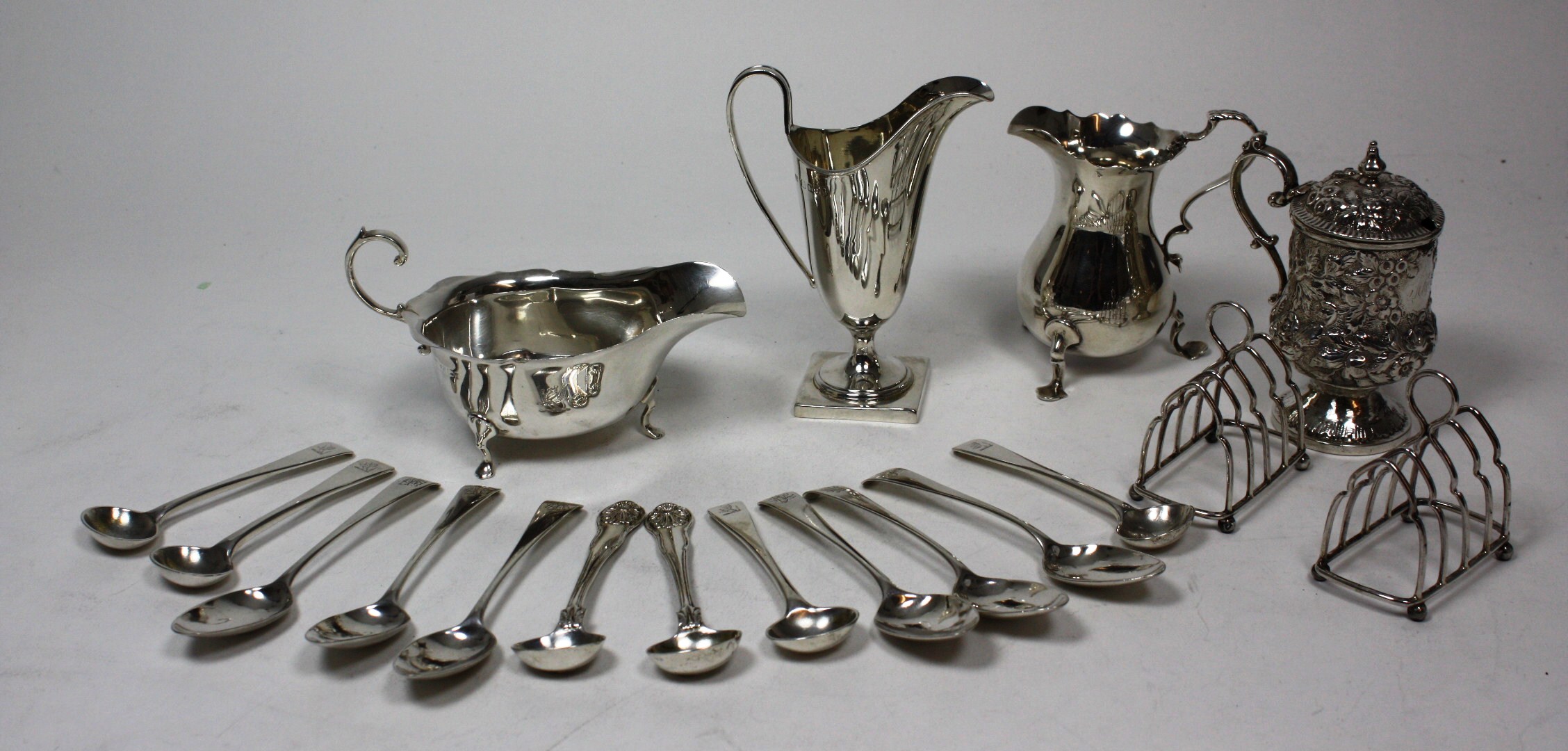 to include two miniature toast racks, two cream jugs, sauceboat, mustard pot and various flatware (qty)
