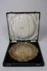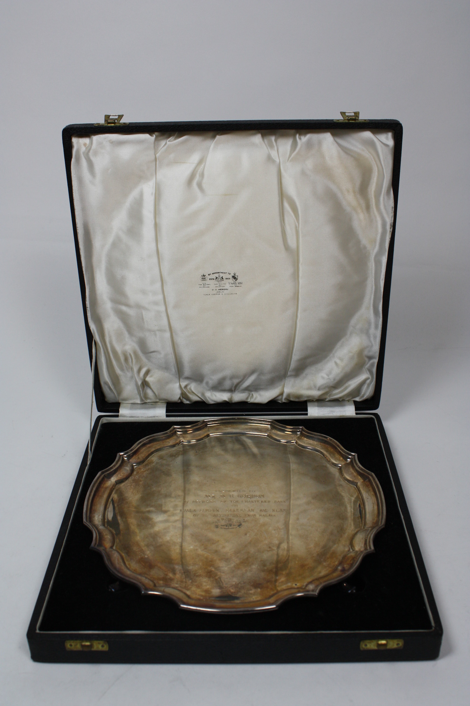 Birmingham 1955, of shaped outline with presentation inscription and raised on four leaf clasped feet, in case of issue