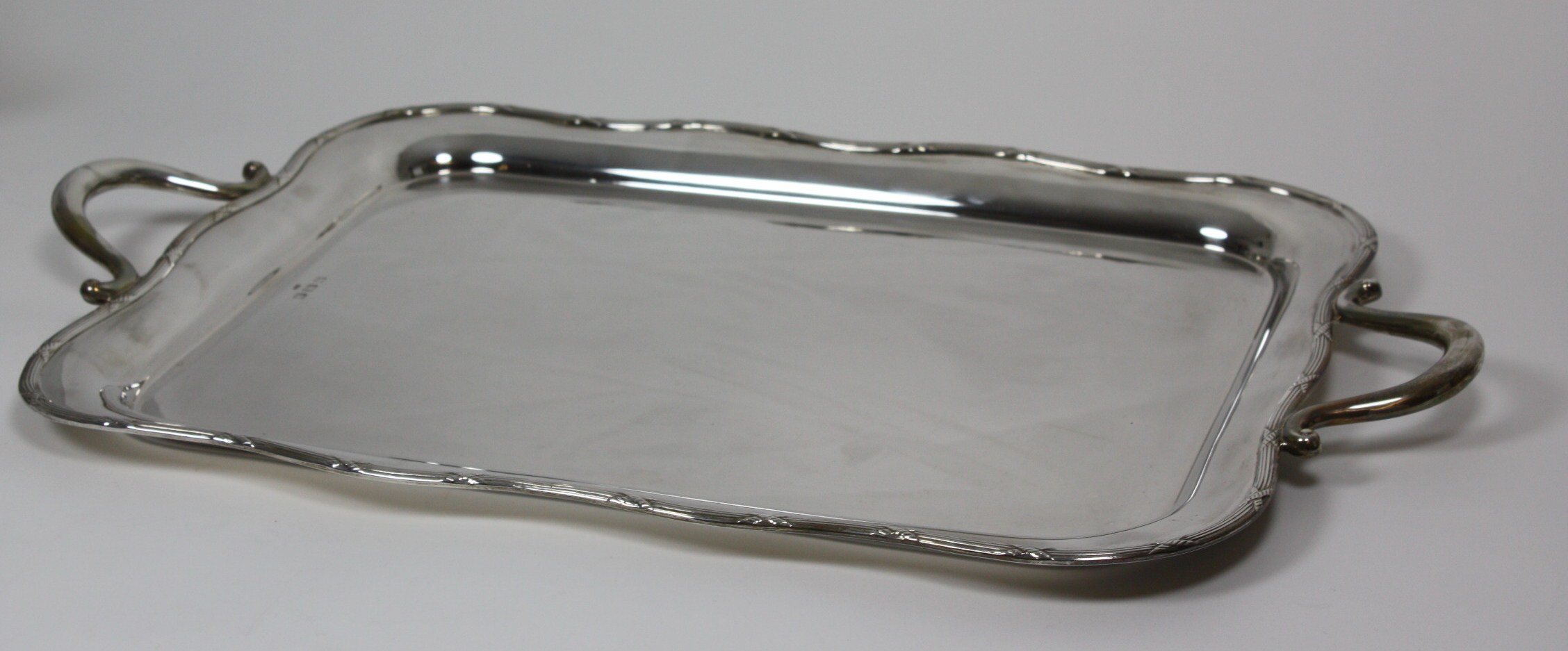 Birmingham 1939, of shaped rectangular outline with reeded and ribboned border, with twin loop handles