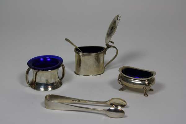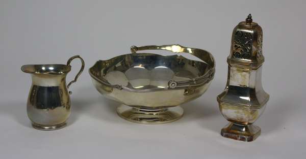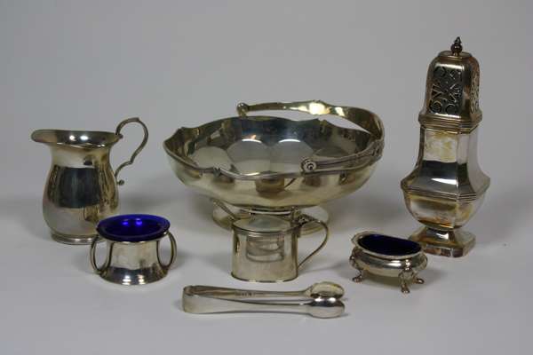 Birmingham 1937, of panelled form with scalloped rim and hinged reeded handle, together with an octagonal sugar caster and baluster milk jug and with a matched three piece cruet and plain sugar tongs