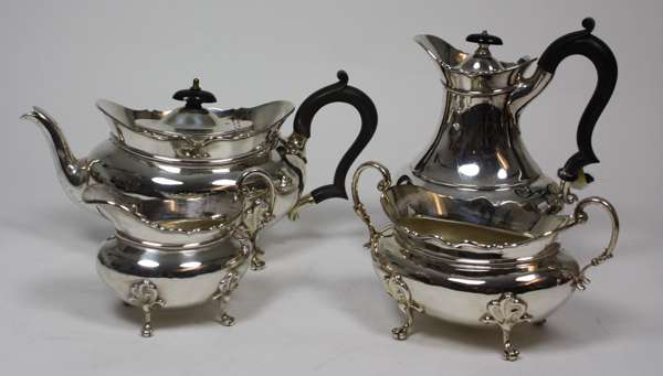 Edwards & Sons (of Glasgow), Sheffield 1912, comprising water pot, teapot, twin handled sugar bowl and milk jug, each with simple baluster bodies raised on paw feet and with S scroll handles (4)