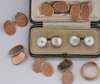 of circular pearl and mother of pearl discs set in white gold, three pairs of 9ct gold oval cuff links, engraved, two 22ct gold wedding bands, a marcasite and pearl set ring (qty)