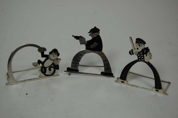 POLICE INTEREST - A set of three amusing silver and enamel place card holders