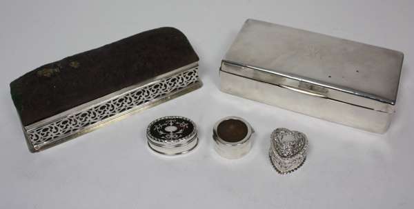 Birmingham 1908, of oval form with tortoiseshell pull off cover with silver inlay, together with two small patch boxes, a dressing table box and a table cigarette case (5)