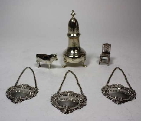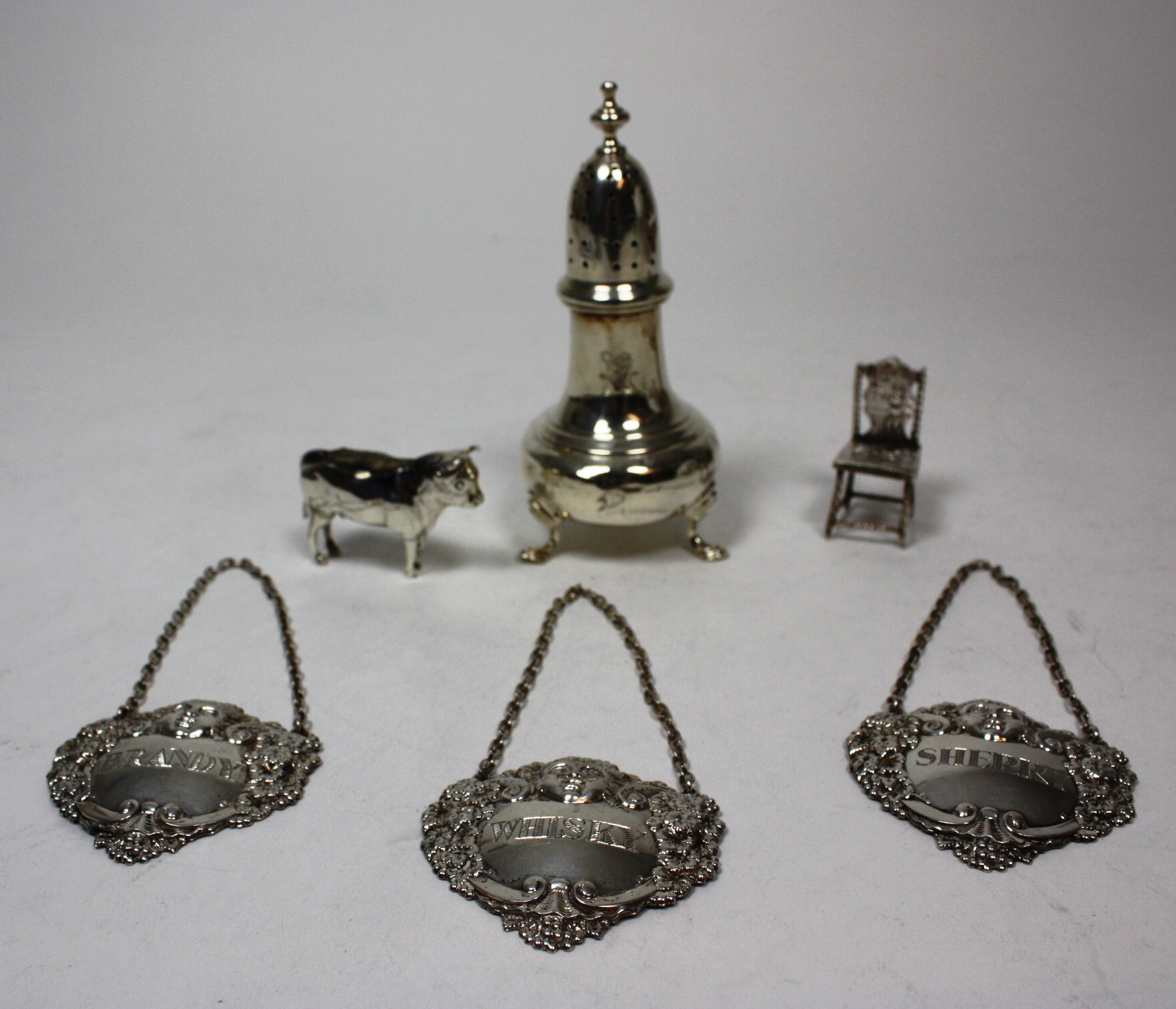 Mappin & Webb , Birmingham 1969, with Bacchanalian figure and fruiting vine surrounding engraved names, a novelty pin cushion formed as a bull, a miniature embossed chair and a George III style sugar caster (6)