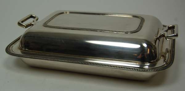 Viners, Sheffield 1938, of rounded rectangular form with gadrooned rims and twin loop handles to lift off cover