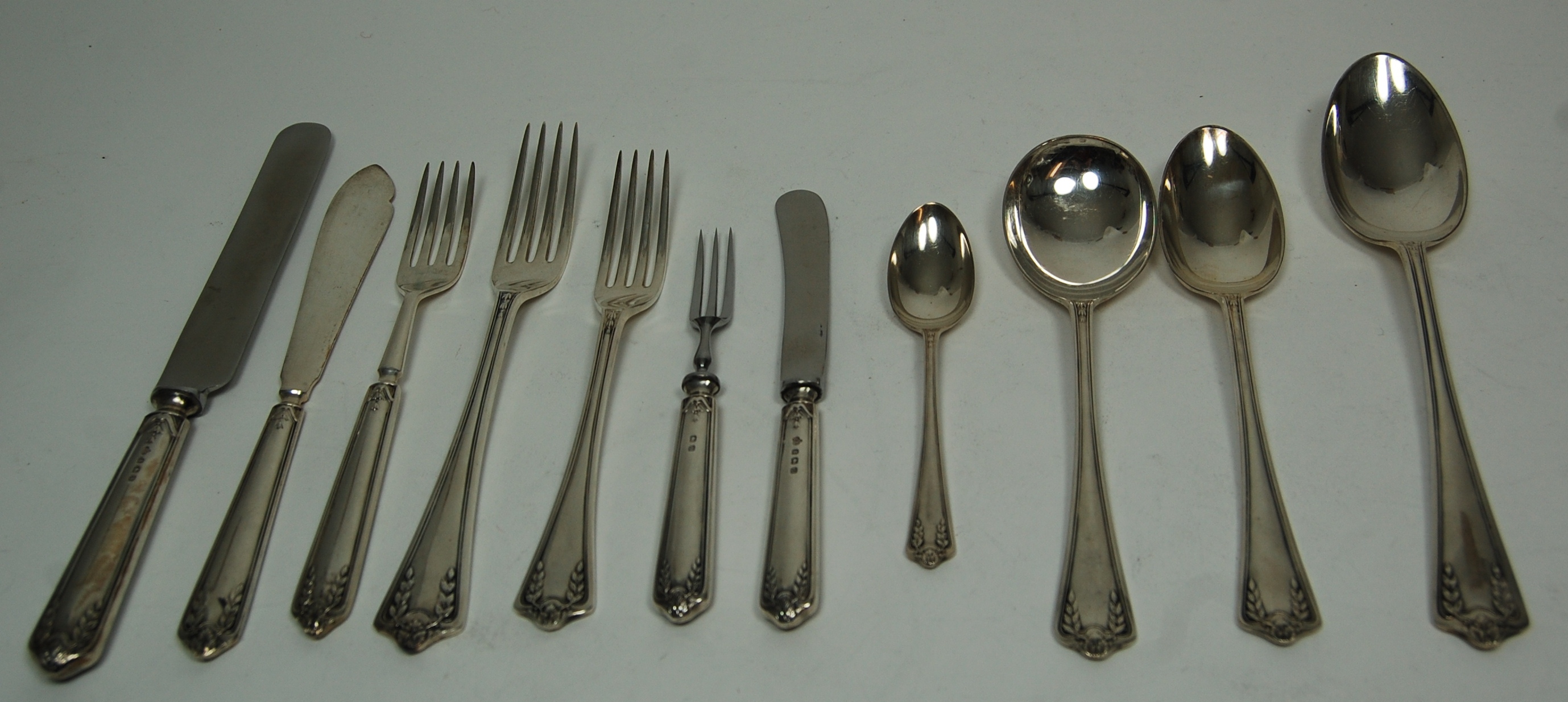 Elkington & Co, Birmingham 1937 &1938, comprising eight of the following; table forks, dessert forks, fruit knives, fruit forks, fish knives, fish forks, teaspoons, dessert spoons, soup spoons, and four serving spoons; with the following in sets of eight with steel blades / tines, table knives, side knives, butter knives, fruit forks (qty)