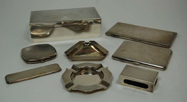 various dates and makers, to include a compact, two cigarette cases, comb and cover, two ash trays, a match box cover and a table cigarette case (8)