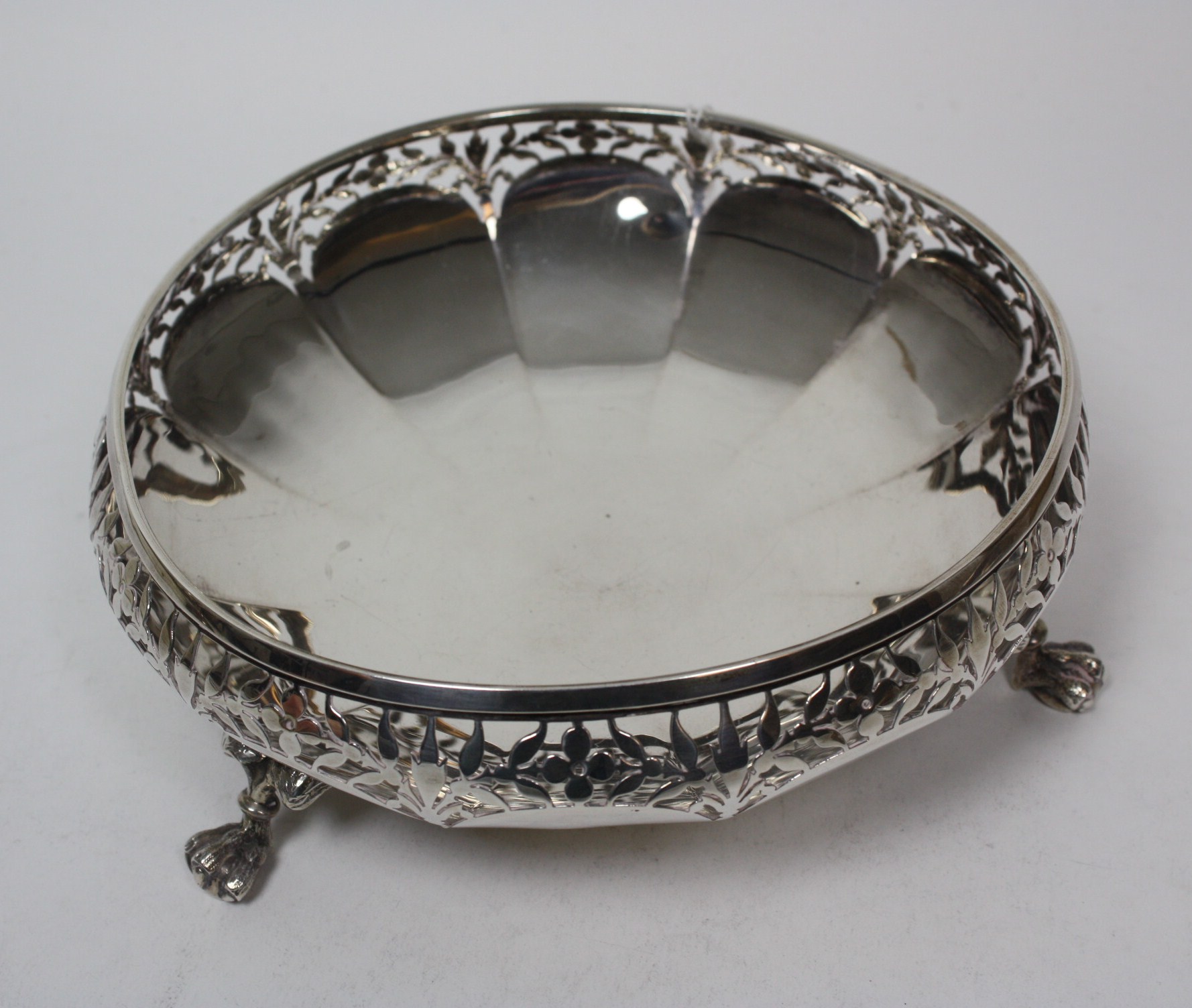 Brook & Sons, Sheffield 1915, of shallow form with lobed body and pierced rim, raised on three winged and claw feet